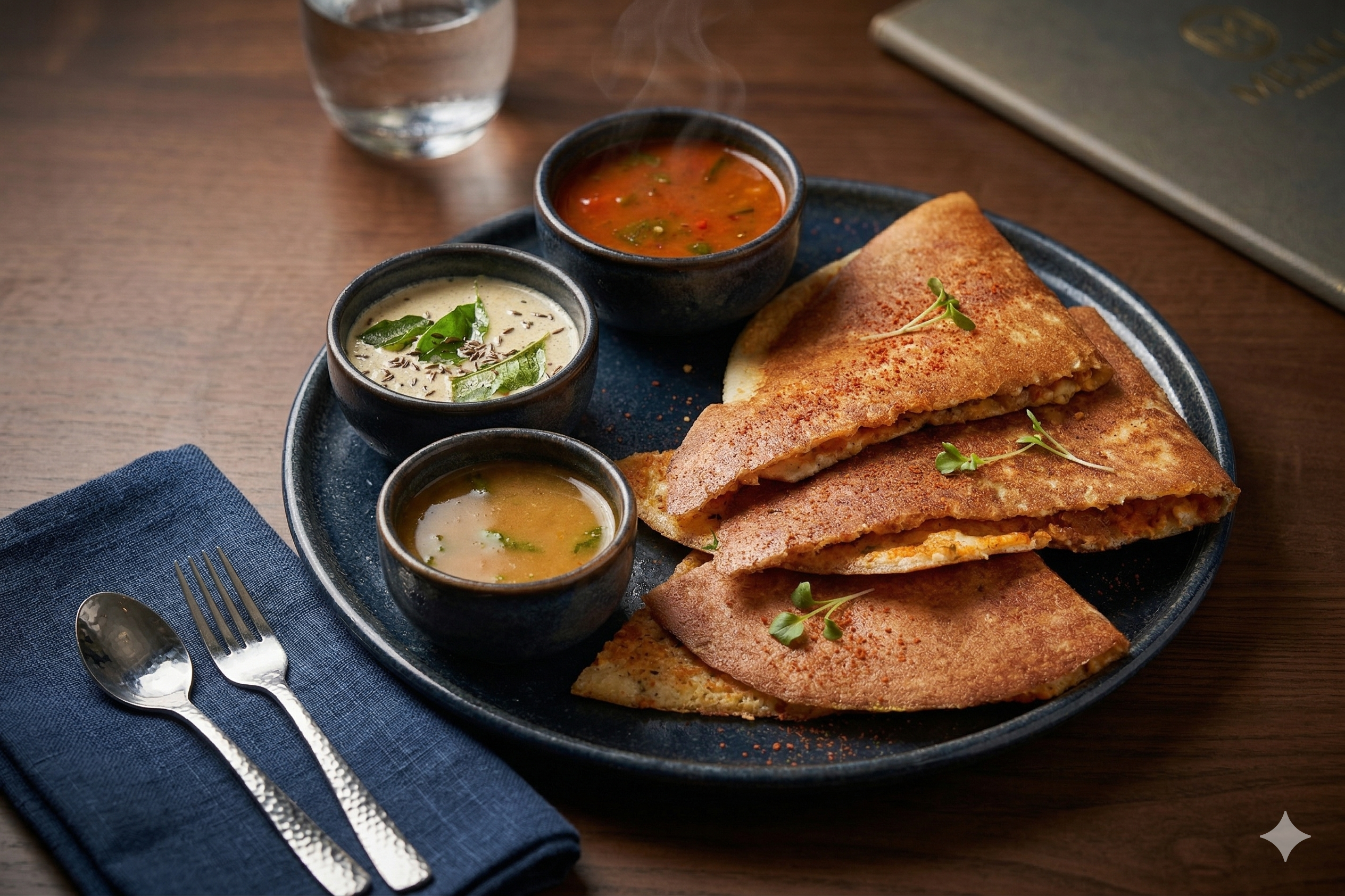 Classic fermented crepe stuffed with spiced potato filling, served with sambar and chutneys.